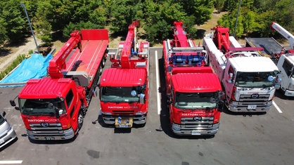 大型車(荷物満載トラック、タンクローリー、観光バス、トレーラー等)対応レッカー車(50トン旋回、クレーン付き等)3台、積載車1台の合計4台での対応です。 これで二輪から大型車までフルカバーでどんな状況のトラブルでもレッカー対応できます。