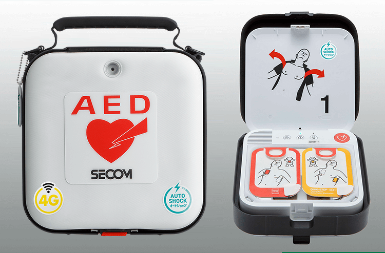 お客様や地域の皆さまの安心・安全のために、**最新型AED「CR2-AUTO」** 未就学児から大人まで心電図を解析し、電気ショックが必要と判断された場合、人によるボタン操作を必要とせず自動的に電気ショックを与えます。 人による操作が不要のため、操作者のためらいにより電気ショックが行われない、または遅れるなどのリスクを減らすことができるものです。 いざという時に命を守る大切な備えとして設置しております。