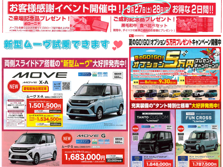 9/27(土).28(日)の2日間、お客様感謝イベントを開催します。 ダイハツの新車をご成約のお客様に『黒毛和牛 食べ比べセット』をプレゼント‼ この機会にぜひご来店ください。 お待ちしています。