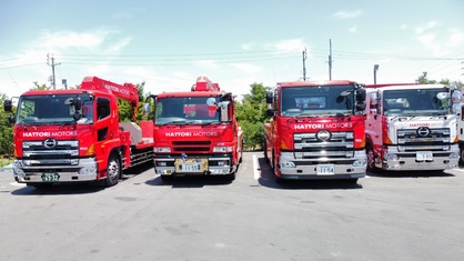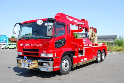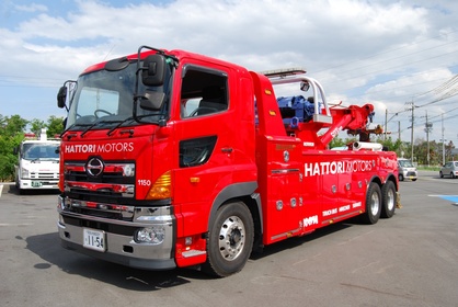 大型車(荷物満載トラック、タンクローリー、観光バス、トレーラー等)対応レッカー車(50トン旋回、クレーン付き等)3台、積載車1台の合計4台での対応です。 これで二輪から大型車までフルカバーでどんな状況の...